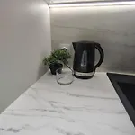 Améliorez votre séjour avec les logements Sunset Sky Studio1 Gdansk doté d'une kitchenette équipée d'une cafétière/théière électrique, d'un réfrigérateur et de la vaisselle pour votre confort.